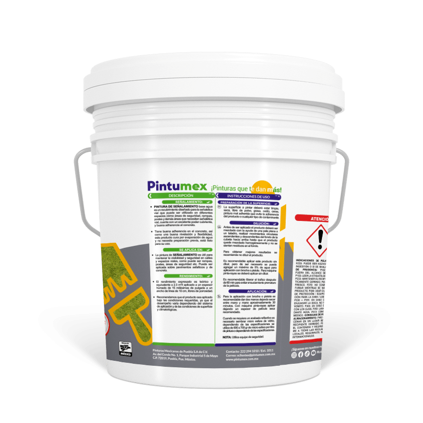 La Pintura de Señalamiento Base Agua una pintura para la demarcación de señalética en espacios viales fabricada a base de resinas acrílicas altamente resistentes. Tiene buena adherencia en el concreto, así como una buena nivelación y flexibilidad, este producto cura por evaporación de agua y no necesita preparación previa, está listo para su uso.