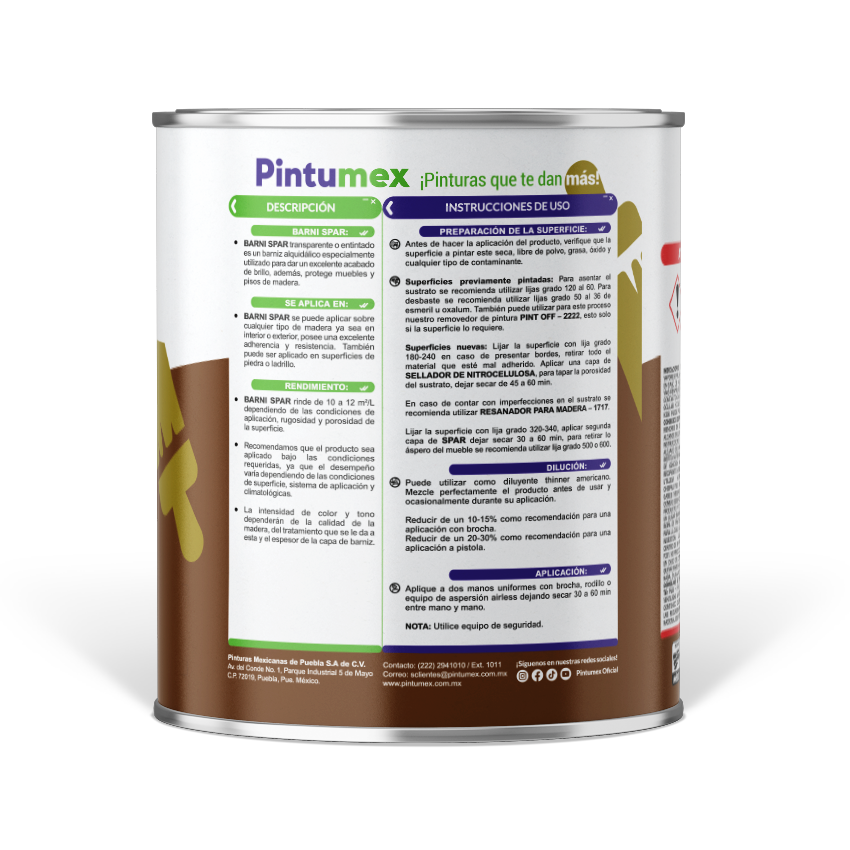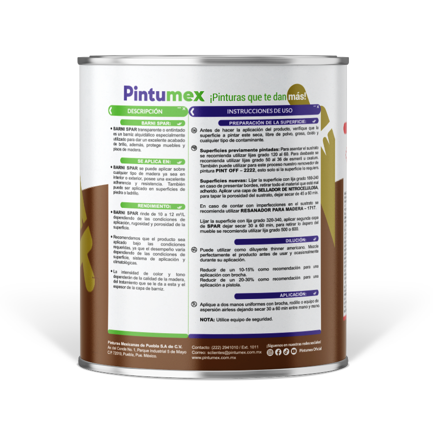 Spar sr da un acabado brillante a la madera virgen o previamente pintada, con excelente resistencia a la intemperie, con buena adherencia y flexibilidad. Spar sr proporciona una excelente resistencia en muebles y pisos de madera. Es de fácil aplicación.