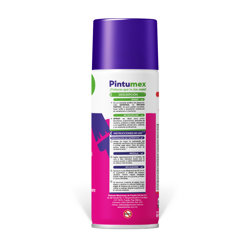 Pintura en aerosol de fácil aplicación, recomendado para interiores como exteriores. Pintura en aerosol proporciona una excelente adherencia en el metal, dando un alto rendimiento, nivelación, resistencia a la corrosión, brinda alta solides a la luz, brillo y además de ofrecer un secado rápido y un alto poder cubriente
